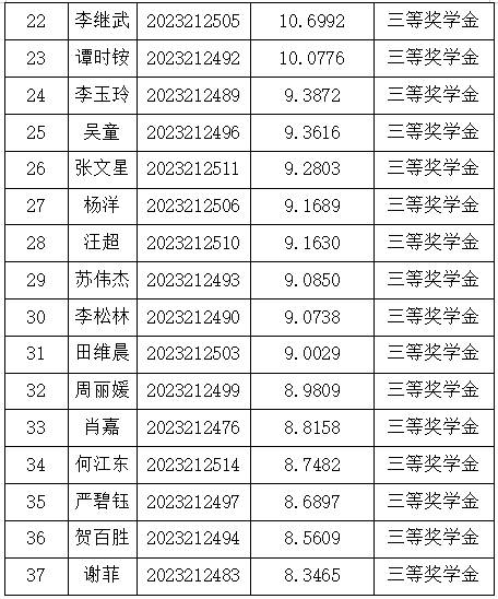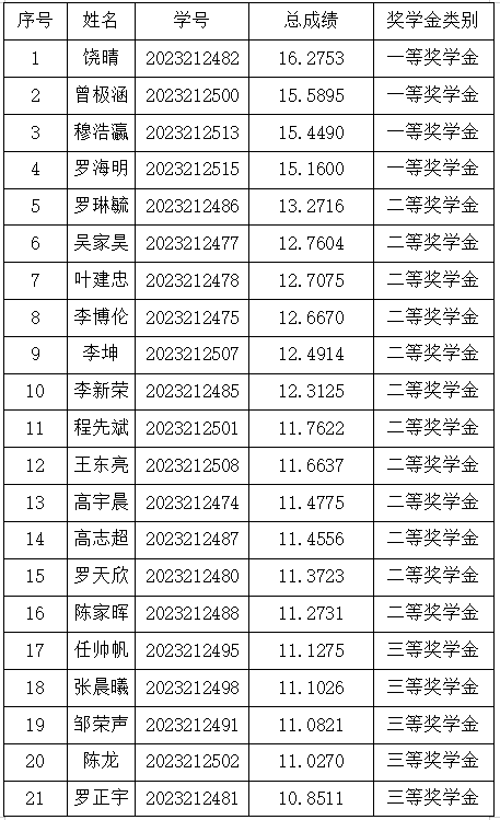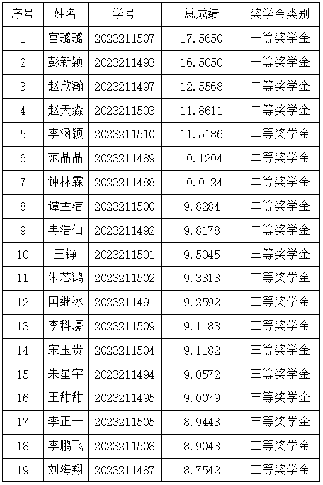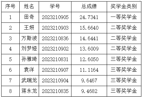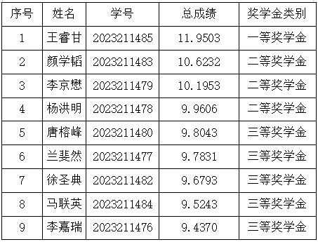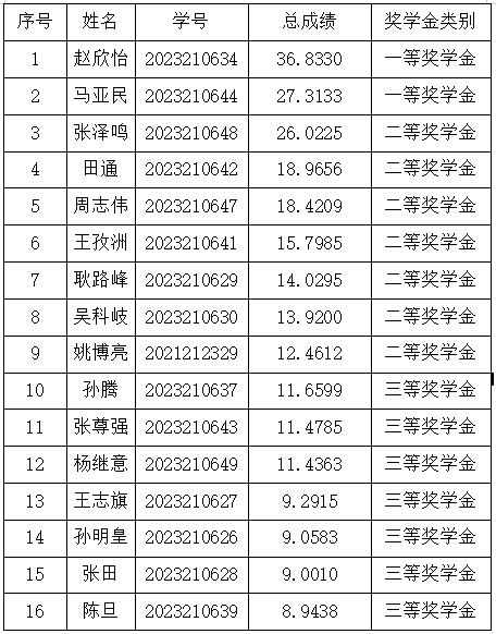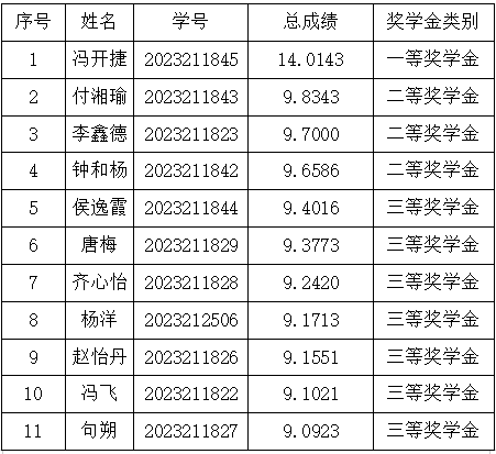 研究生奖(助)学金评定办法(修订)》,按综合成绩排名确定最终获奖类别(综合成绩=学业成果成绩+思想道德素质评价成绩+第二学年综合成绩*10%),现将2023级2024-2025学年研究生学业奖学金获奖名单公示如下: